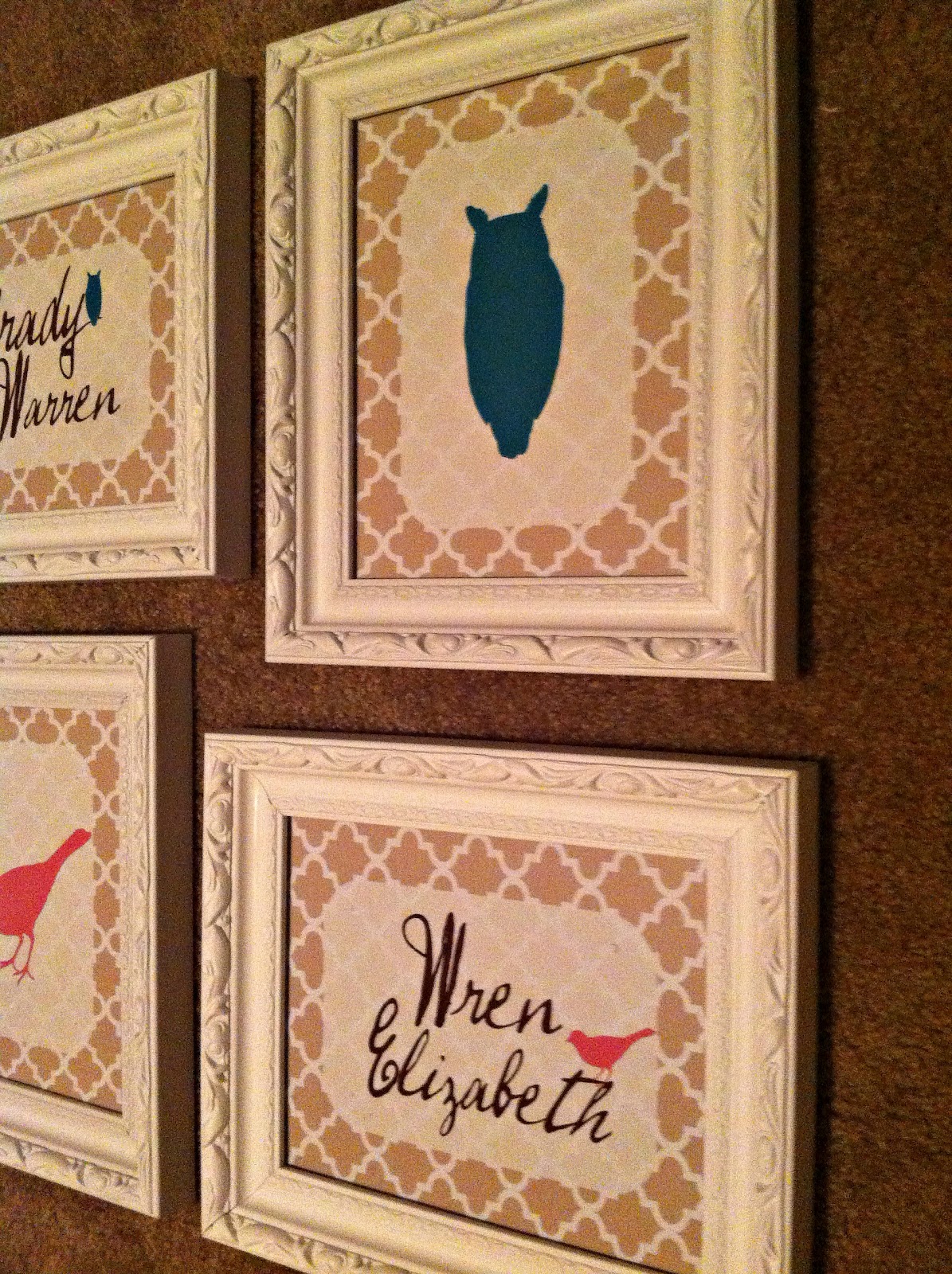 I had Sam's Online Photo Center print them, and they were mailed to my house this week. After they came in, I paid a visit to Hobby Lobby (where frames are always 50% off) to find white semi-ornate frames.